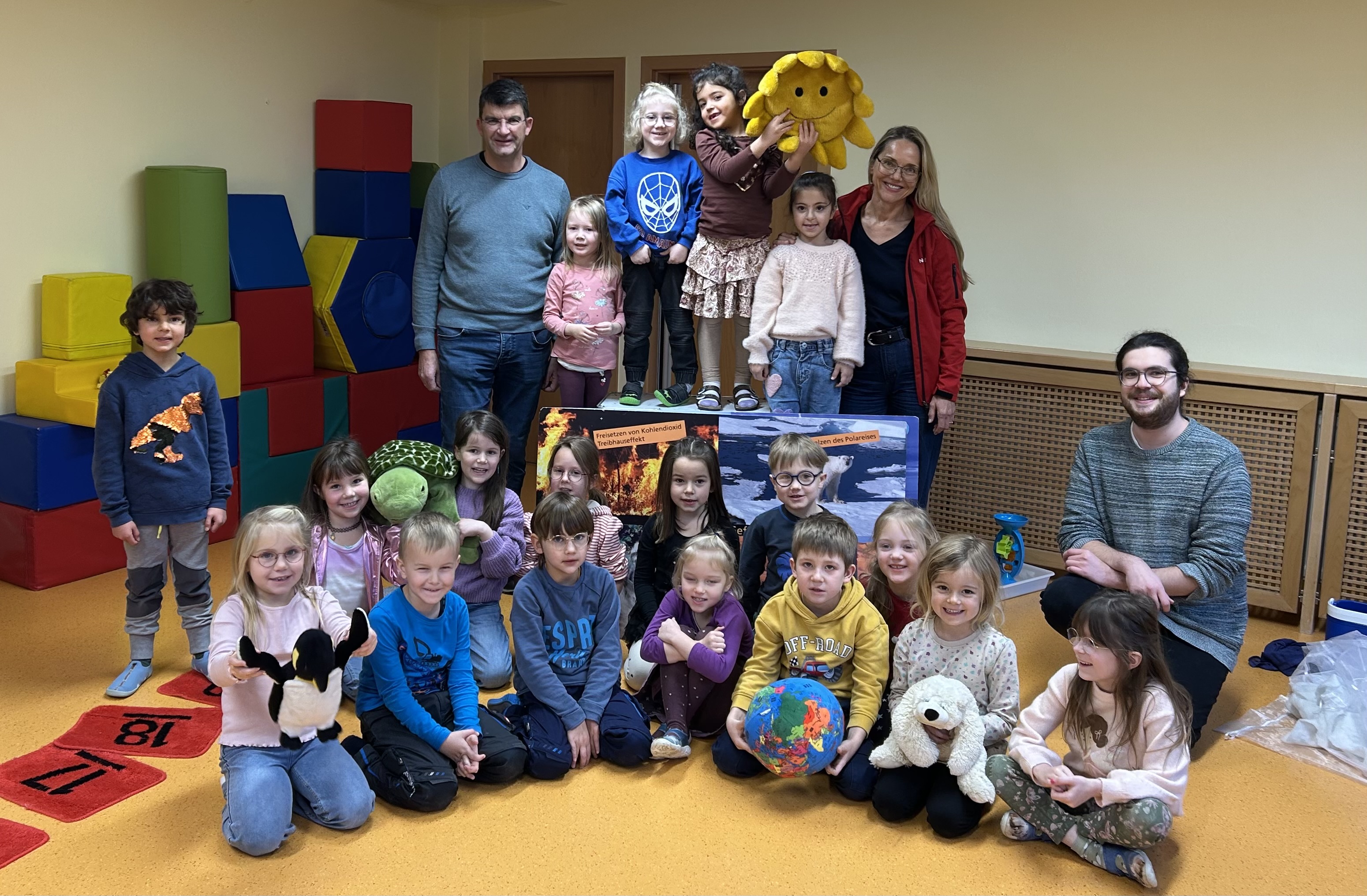 Das Museum im Koffer besuchte die katholische Kindertagesstätte Peter und Paul in Freystadt. Das Bild zeigt die Kinder mit Bürgermeister Alexander Dorr (links), Sonja Olbrich, Betreuerin für kommunale Kunden bei der N‑ERGIE und Kindergartenleiter Daniel Mederer (rechts).